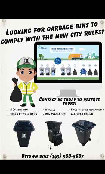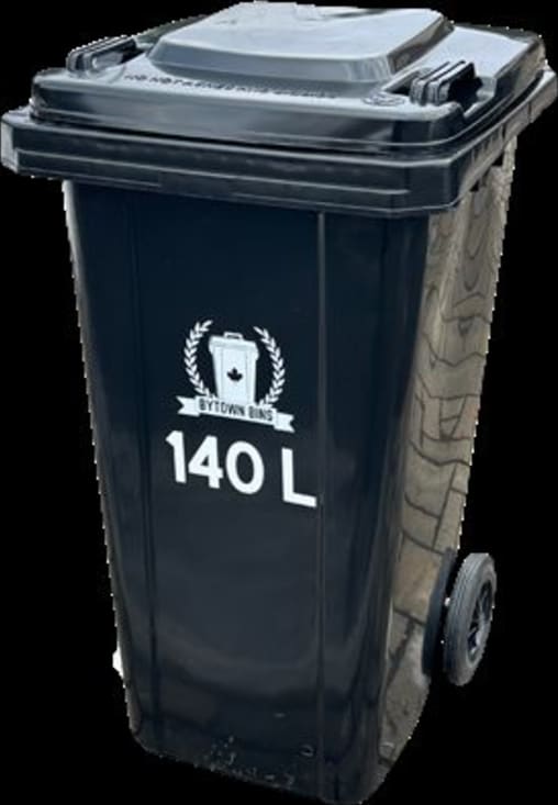 We at Bytown Bins are excited to present our premium 140L bin, featuring convenient wheels and a removable lid, thoughtfully designed to comply with the City of Ottawa’s latest waste management regulations where each household is allowed 3 x 140L bins.This spacious bin accommodates up to three garbage bags, making it perfect for all your waste disposal needs.